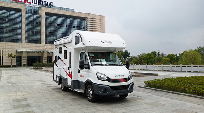 该款车型采用依维柯二类底盘,是公司自主研制开发的中高端新型房车之一,整车长度不超过六米,蓝牌C照即可驾驶,车内配备有安全座椅、洗浴、厨具灶具、床铺、娱乐等设施,可以实现人员户外宿营、旅居等,是军工技术在民品产业的重要应用,克服了厢板压制、系统集成、结构优化等多项技术,为广大游客带来全新的旅游生活新方式。