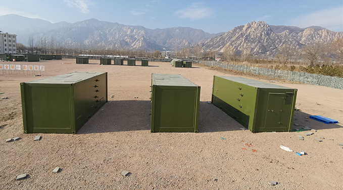 污水垃圾处理模块由污水处理单元和垃圾处理单元组成,主要用于无依托条件下为任务部队大规模集结、修正、轮换提供较为持久、功能齐全的野战宿营保障。具备600人野战条件下污水、餐厨和生活垃圾处理能力。该模块能够在低温-40℃-高温50℃,海拔4500米以内环境条件下正常运行;可实现污水72小时快速处理;可满足污水每小时处理量不小于3立方米,餐厨及生活垃圾日处理量不小于1吨的要求;外形采用CAF60标准方舱结构,并配有叉车槽,能够满足陆运、空运、海运等多种运输要求,机动性较高。