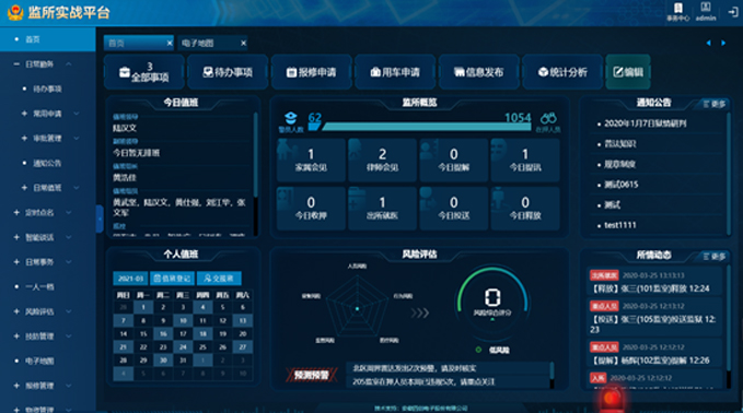 监所实战平台以监所实战业务为导向,以物联网、大数据为手段,升级、完善、整合安防系统和被监管人员信息系统,实现监所技防管理、动态信息主导勤务、风险评估、执法监督四大业务功能,旨在提高监所风险预警和突发事件处置能力,是监所实战管理的“大脑中枢”。